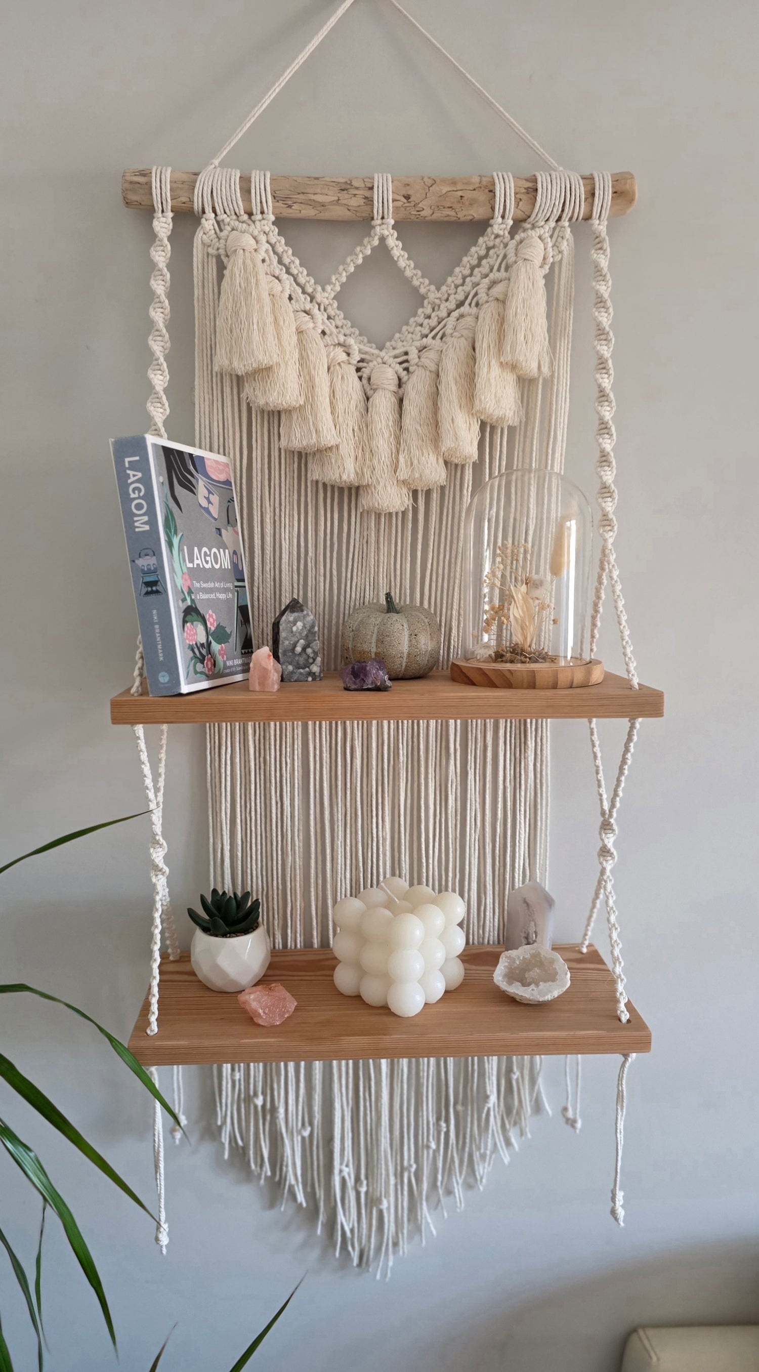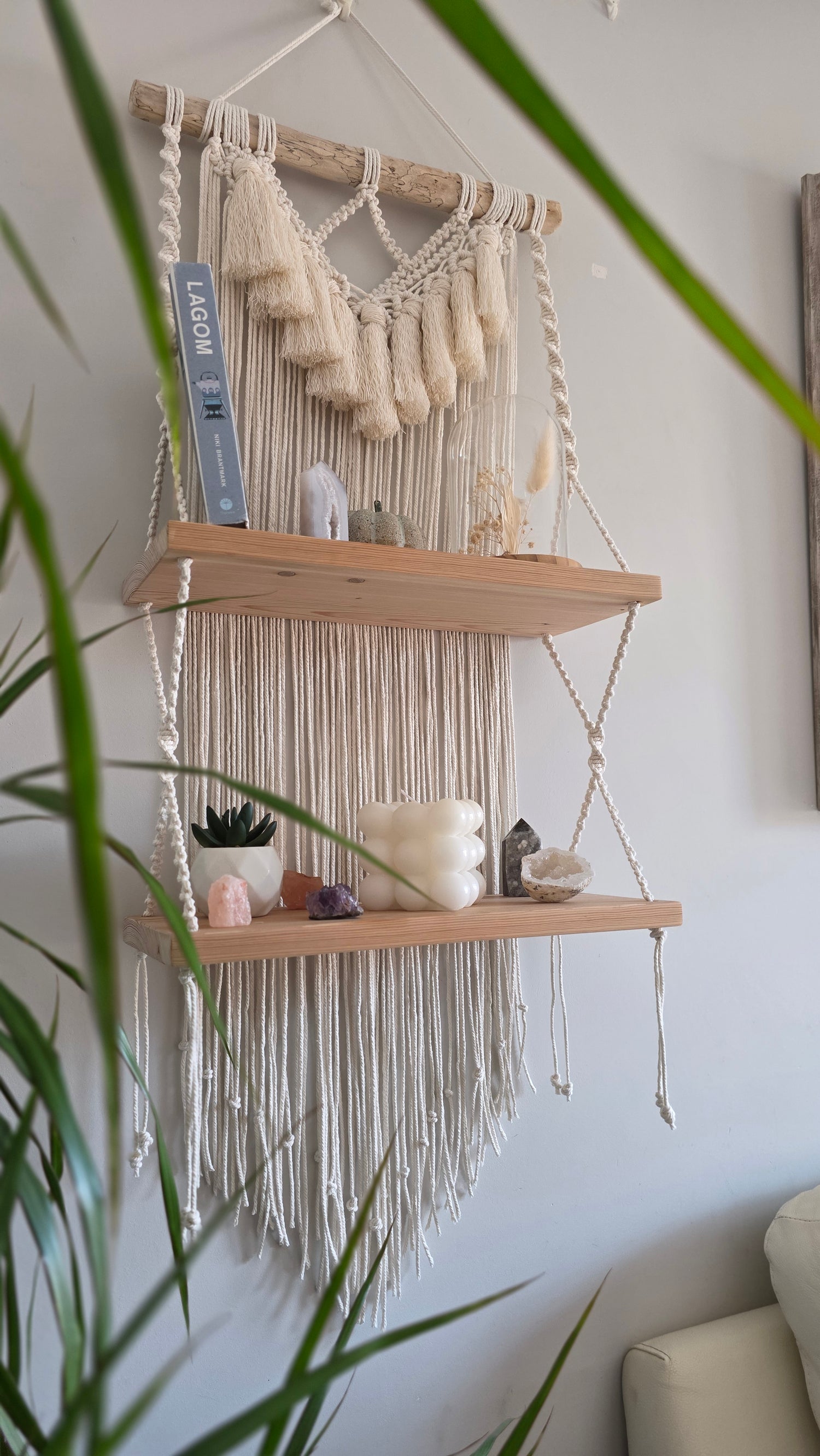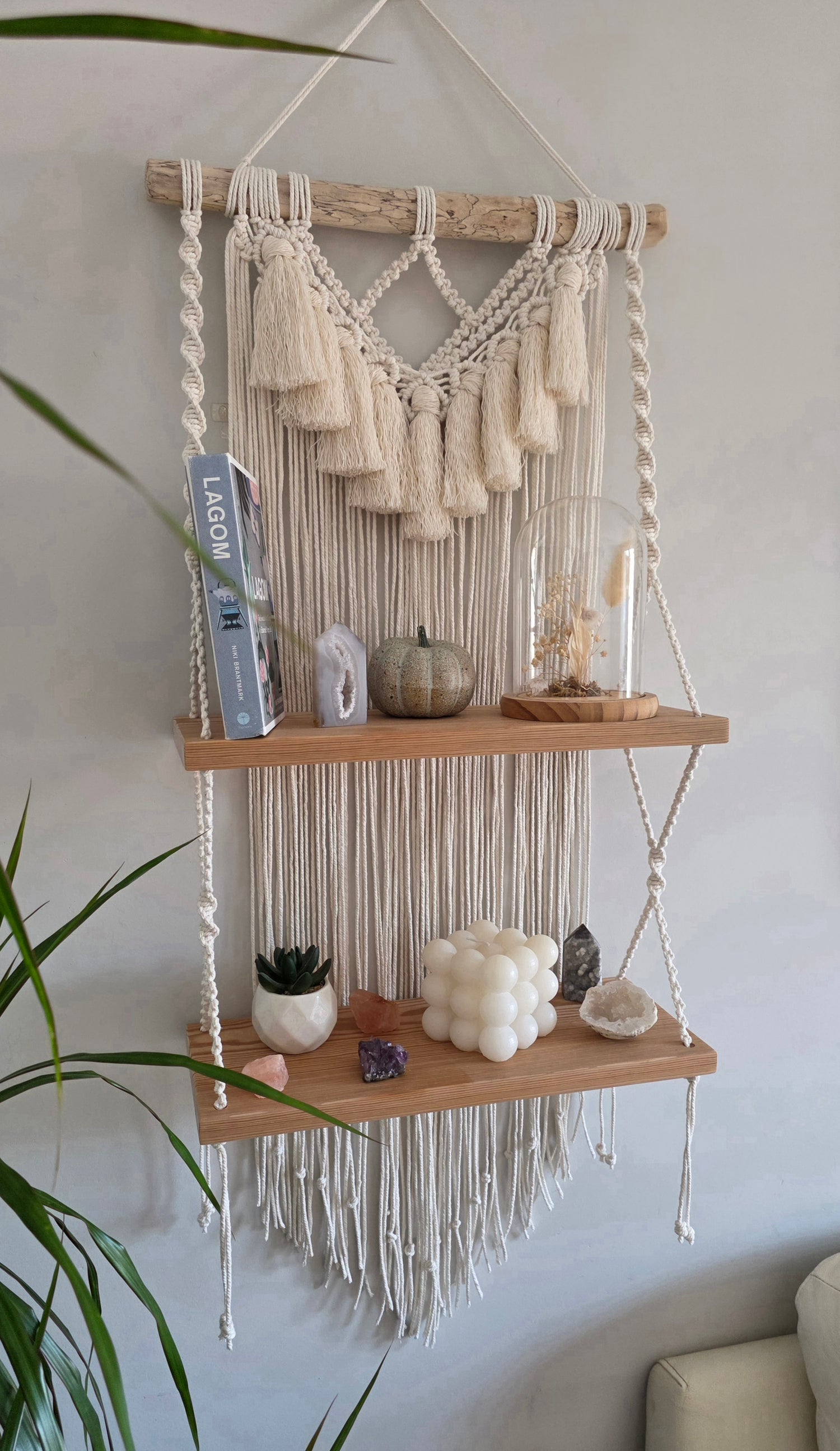 This handmade double macrame hanging shelf is a fantastic way to have both - a beautiful wall decor and a practical shelf, somewhere to put all your lovely things up!