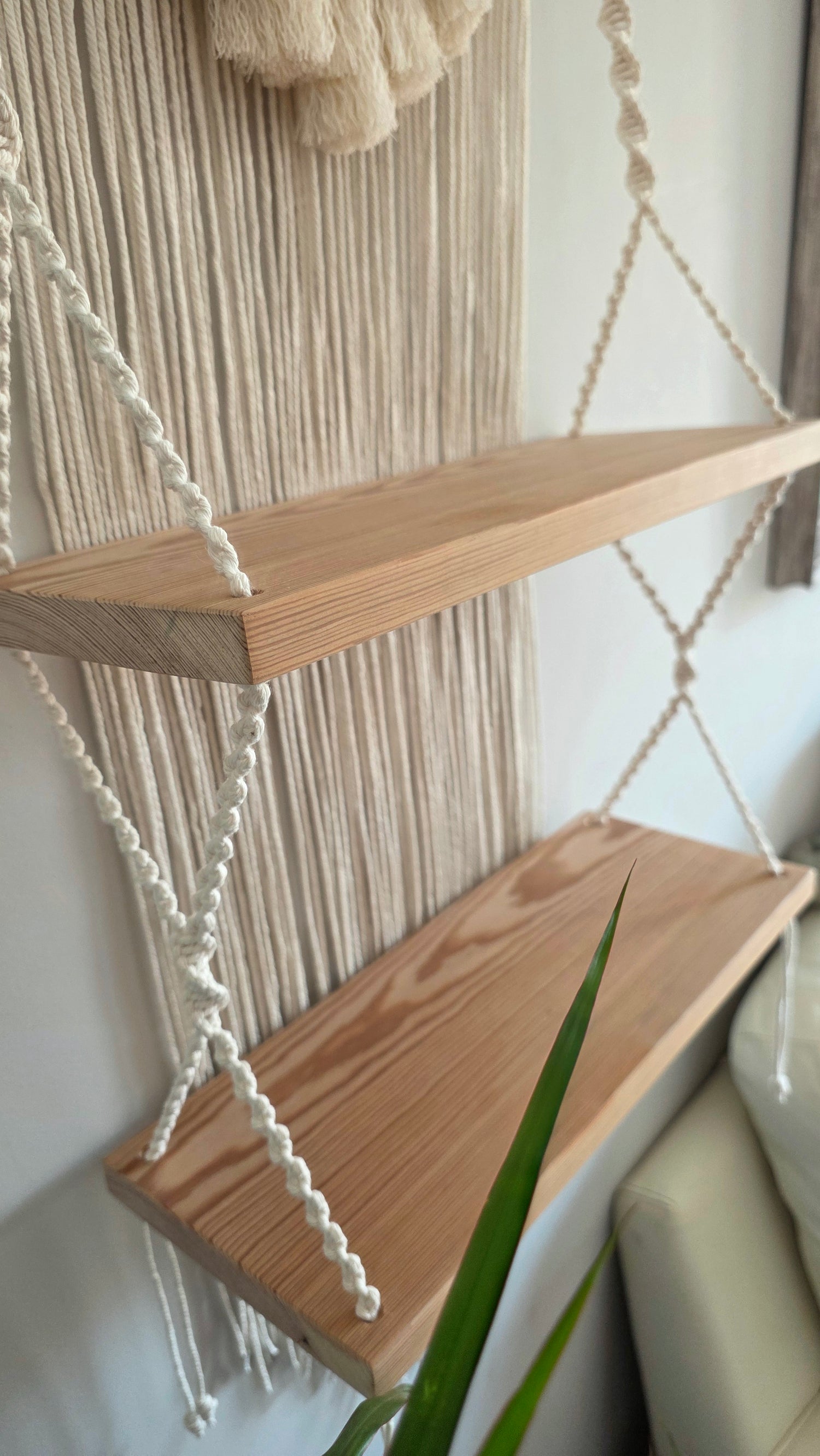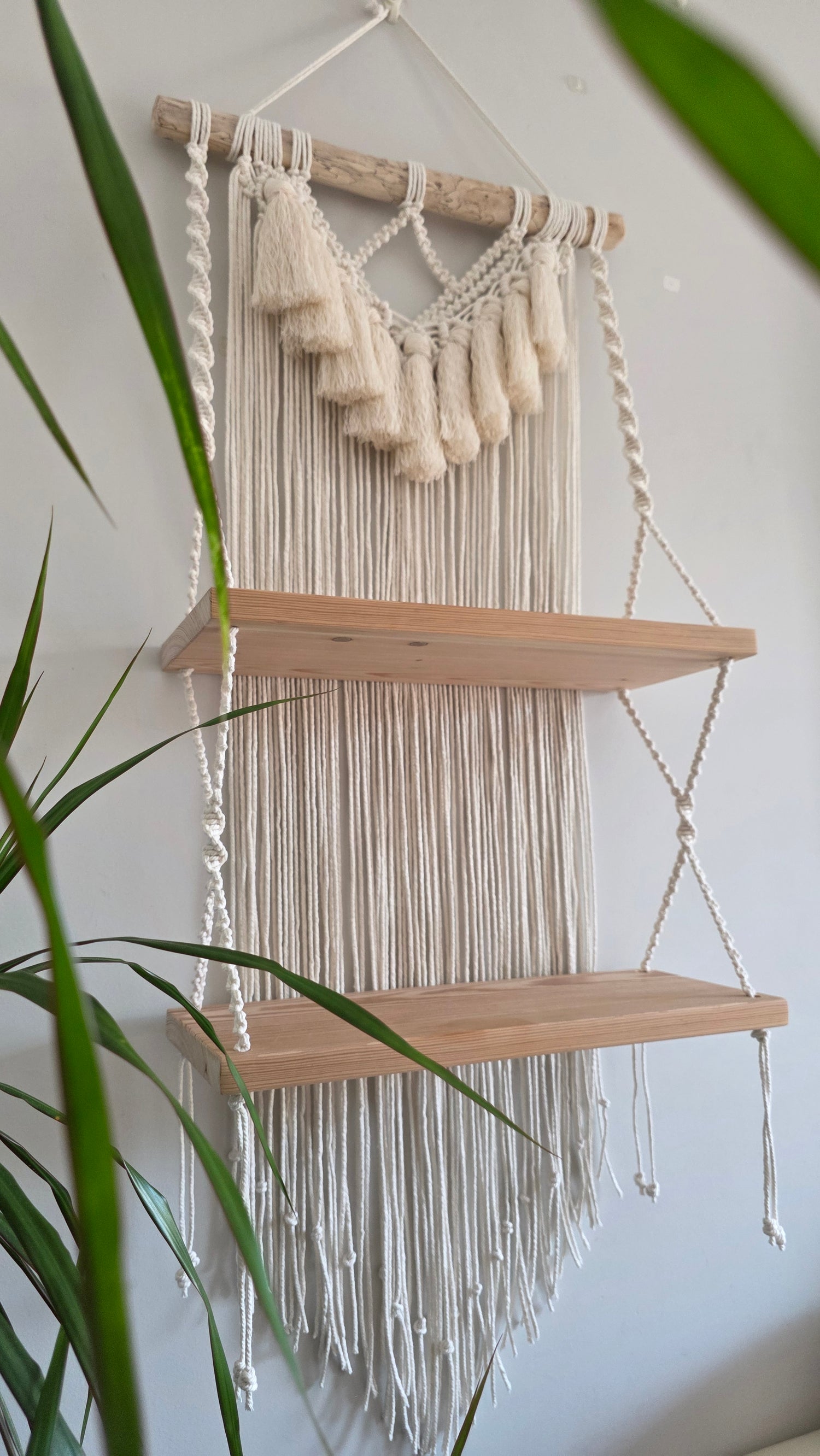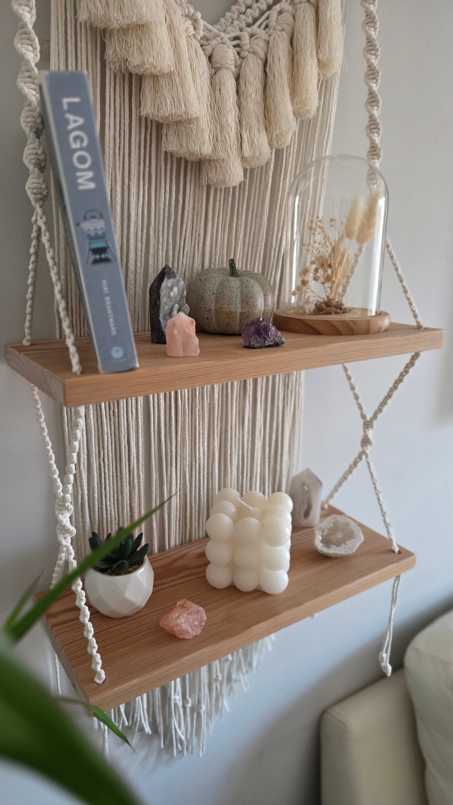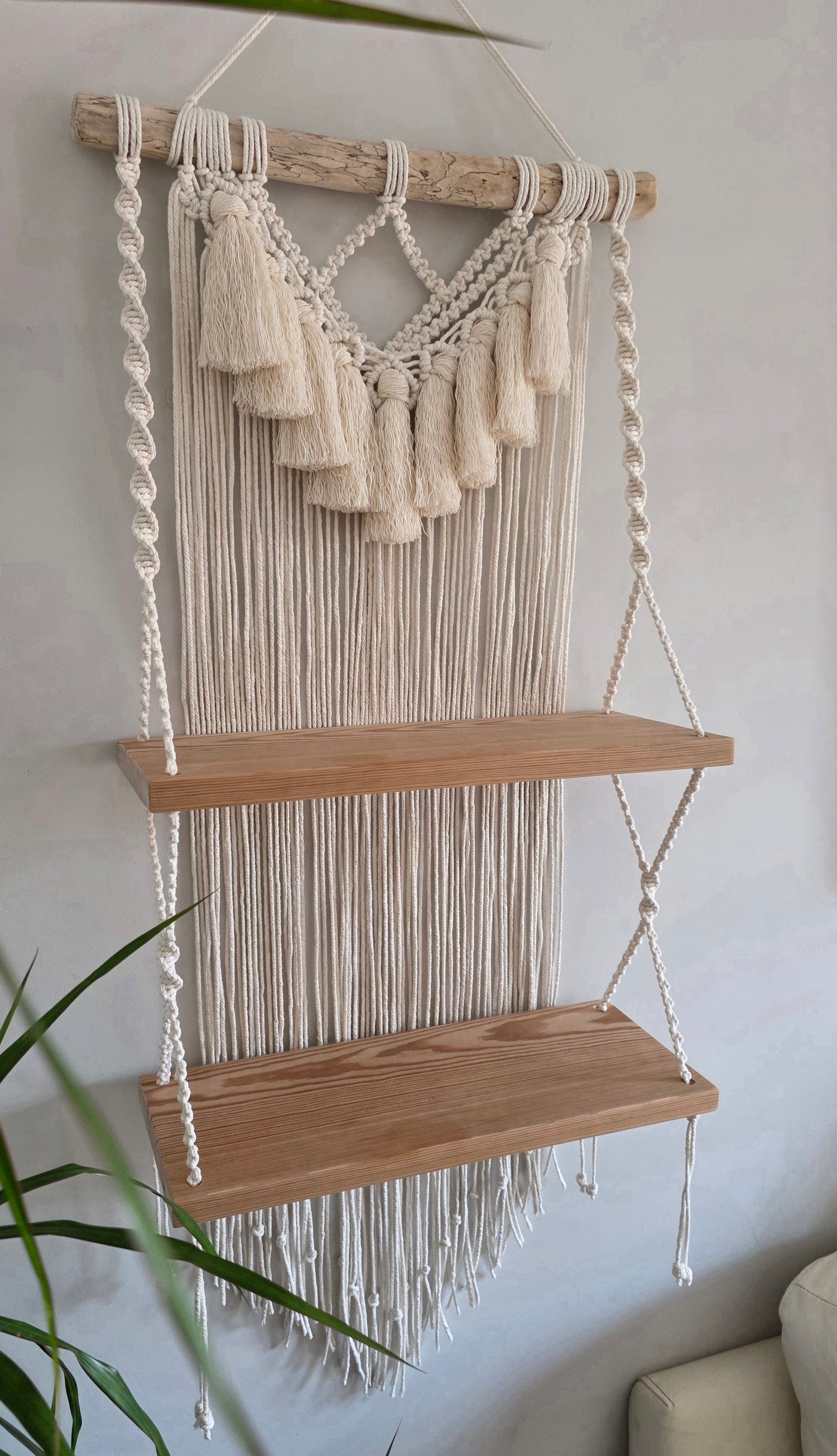 This handmade double macrame hanging shelf is a fantastic way to have both - a beautiful wall decor and a practical shelf, somewhere to put all your lovely things up!