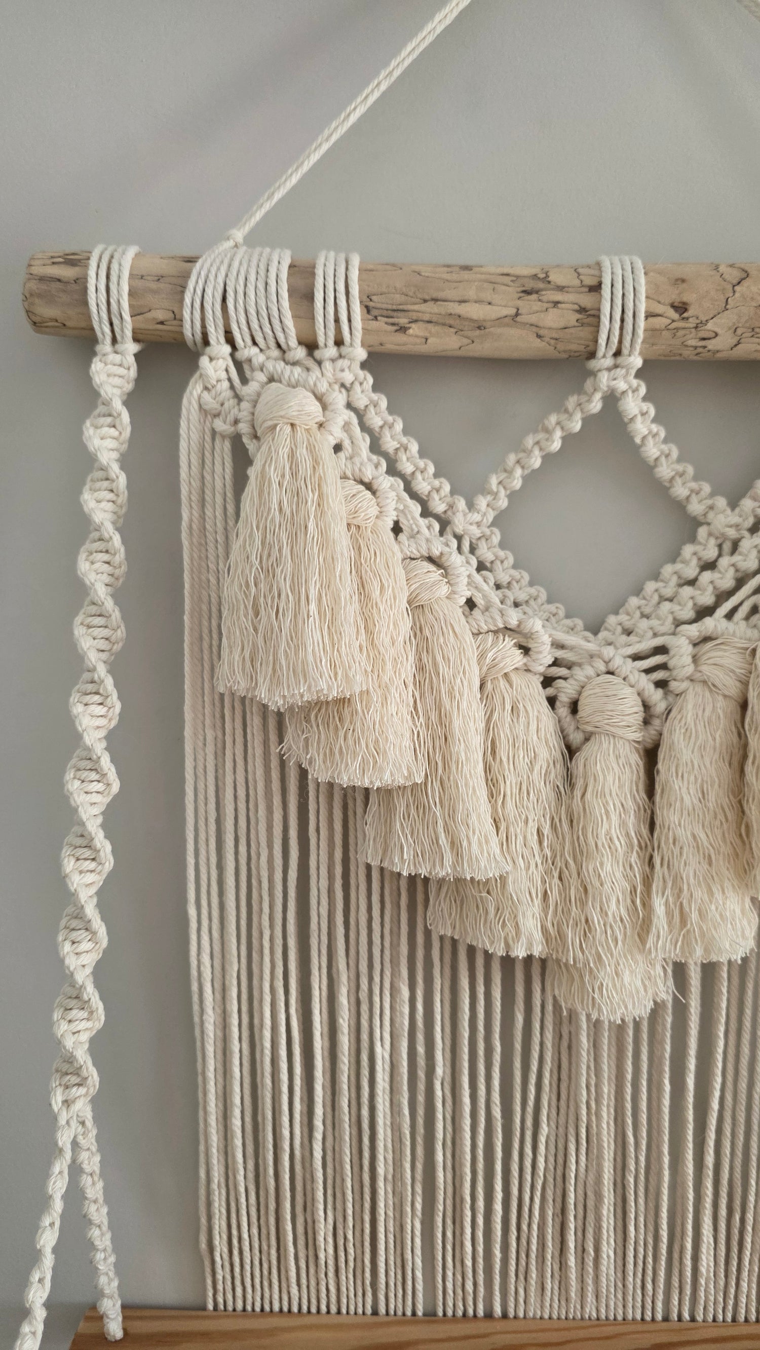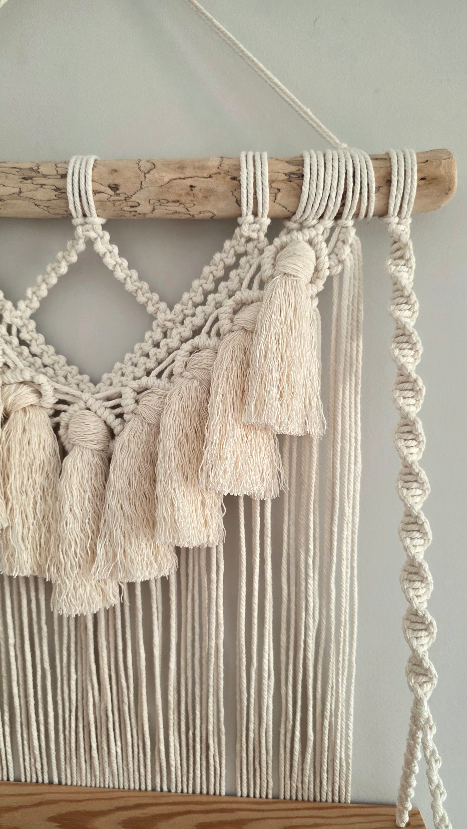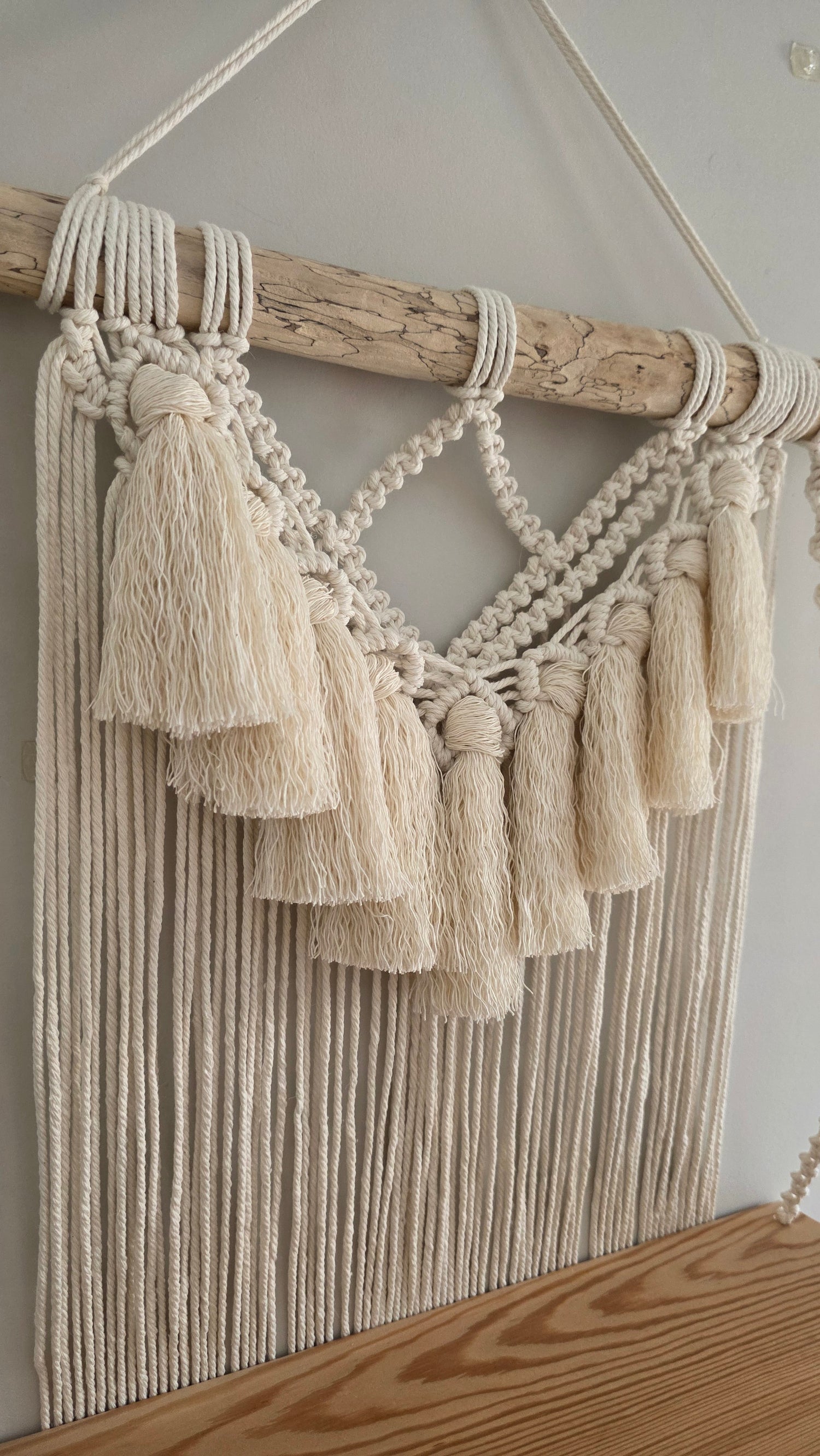 Created using naturally beige cotton cord, dried and sanded wood branch and two reclaimed wooden floorboards for that added old rustic look.