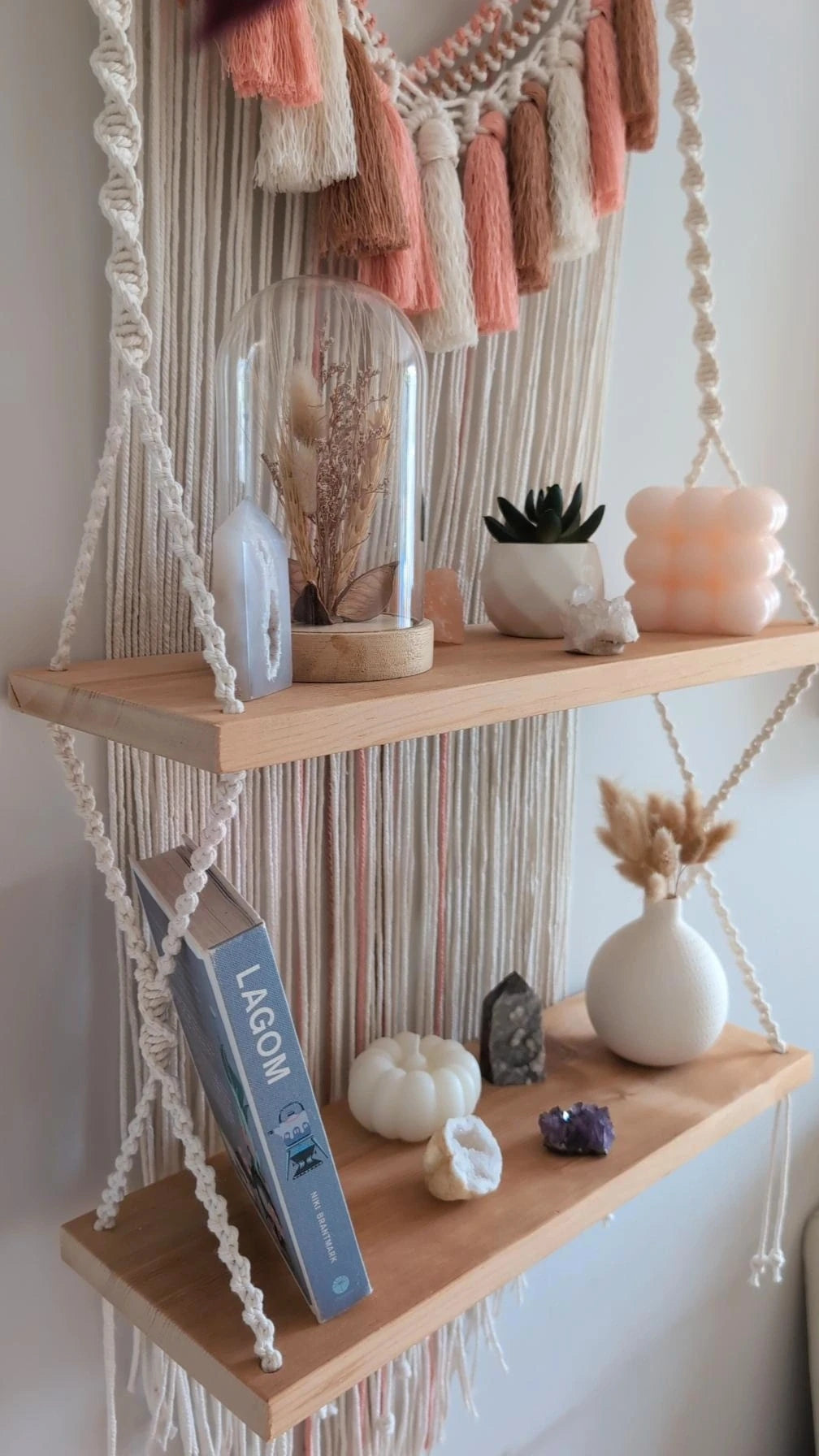 This handmade double macrame hanging shelf is a fantastic way to have both - a beautiful wall decor and a practical shelf, somewhere to put all your lovely things up!
