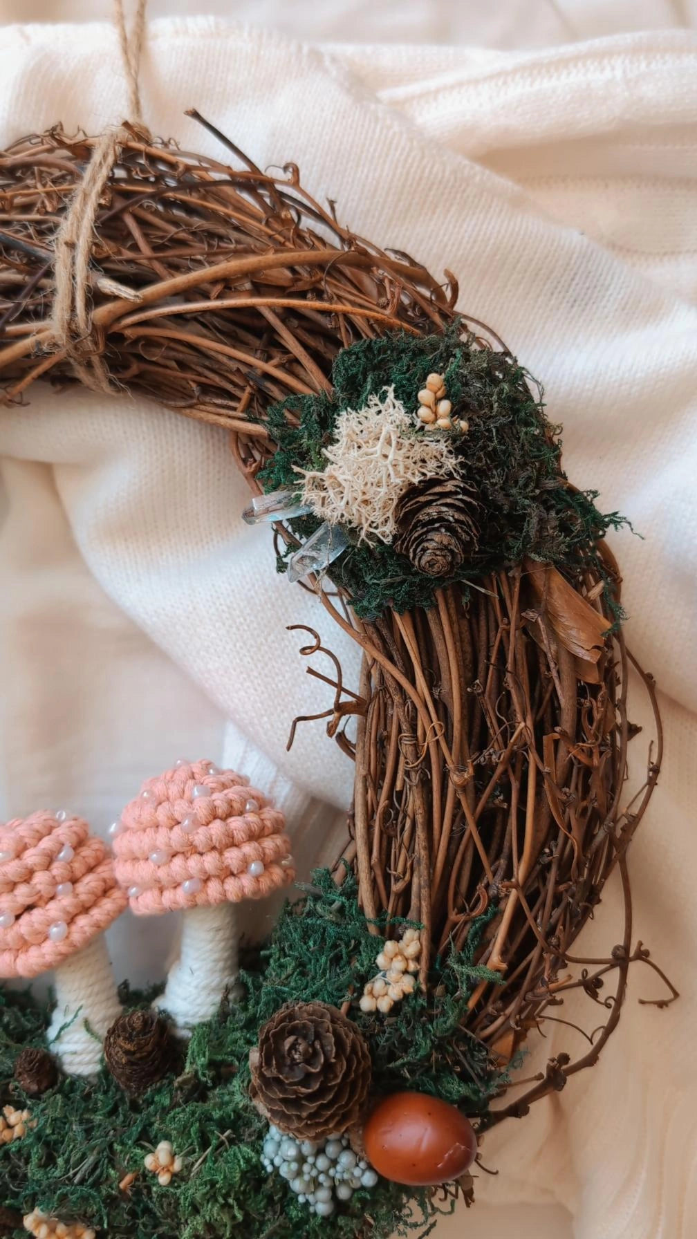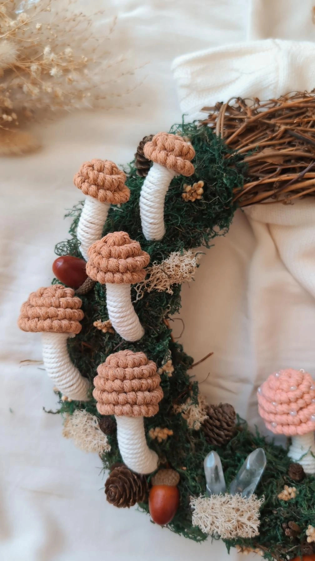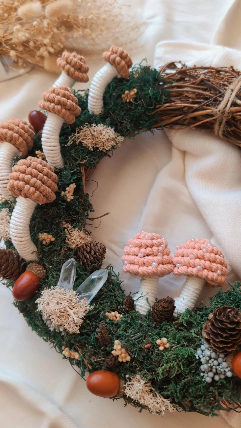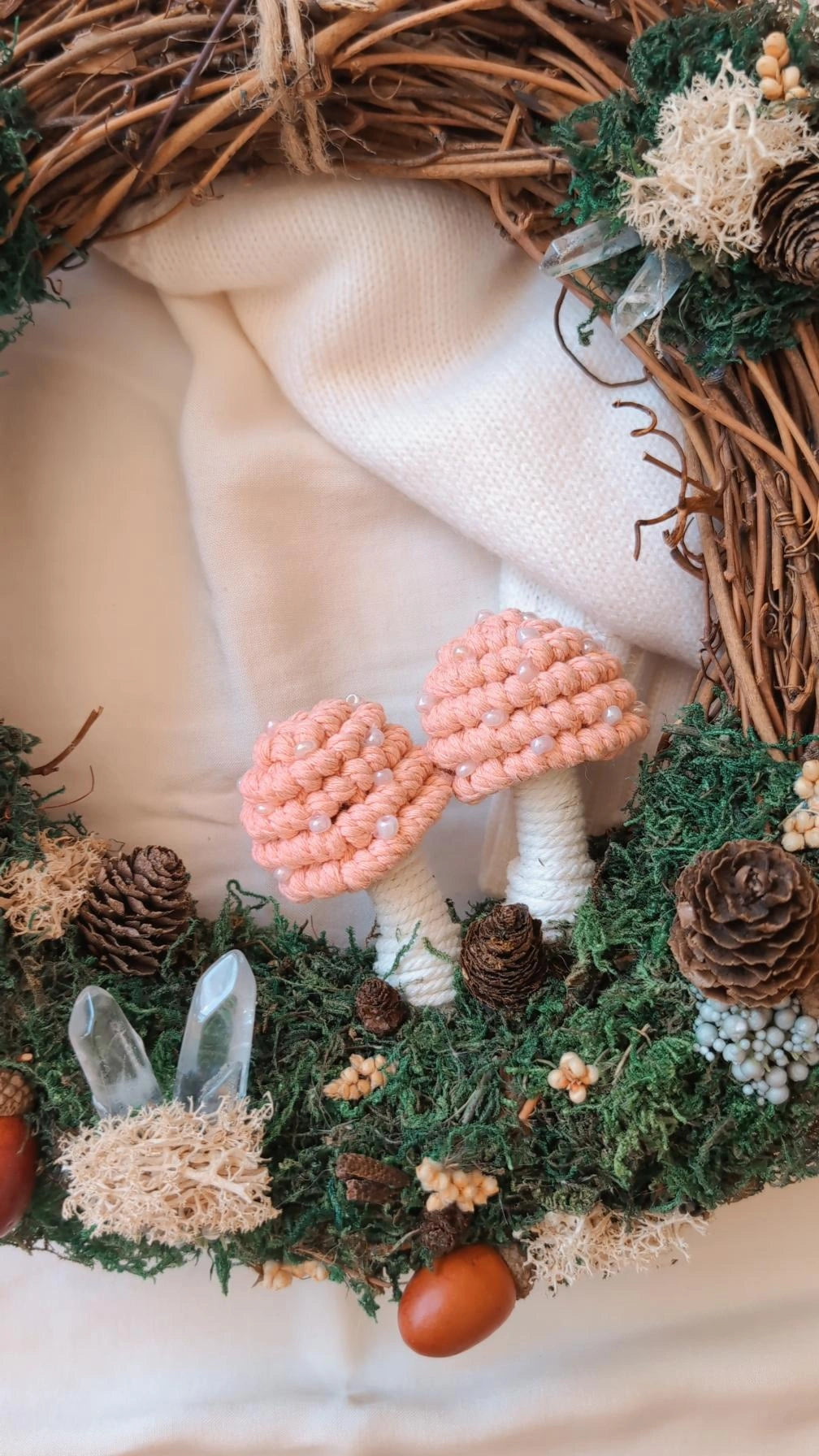 Full of little magical things, it's made using dried moss, beautiful clear quartz crystals, acorns, pine cones and a bunch of super cute macrame mushrooms - all on a grapevine wreath measuring 30cm in outer diameter.
