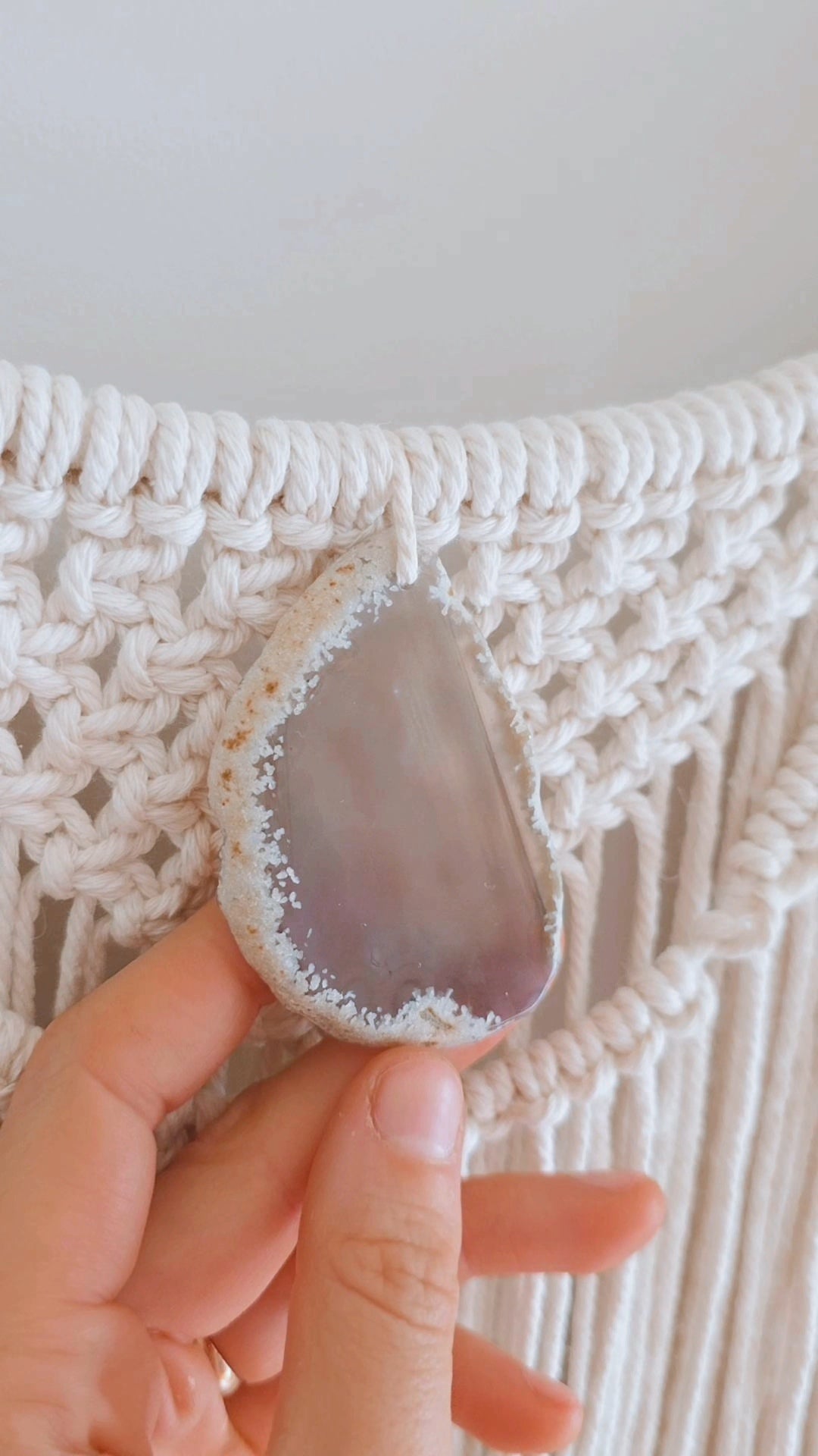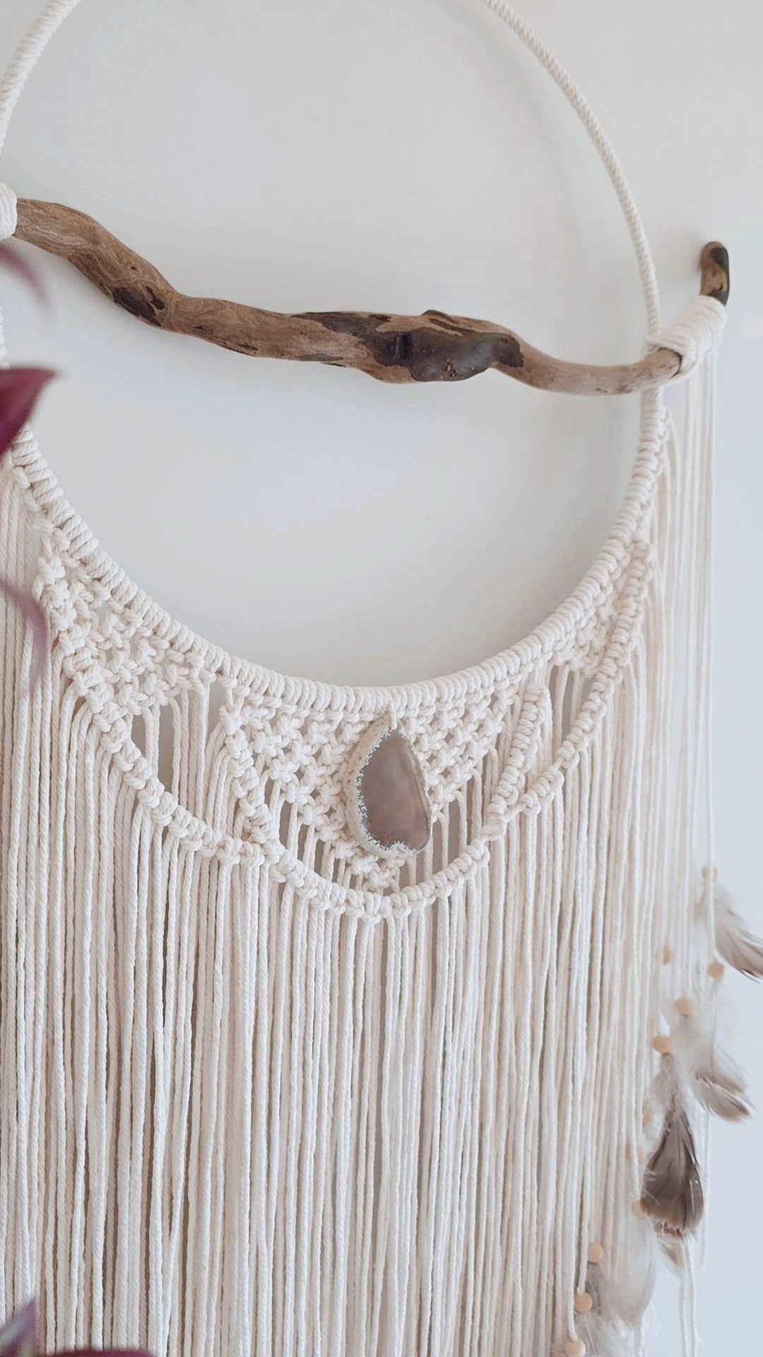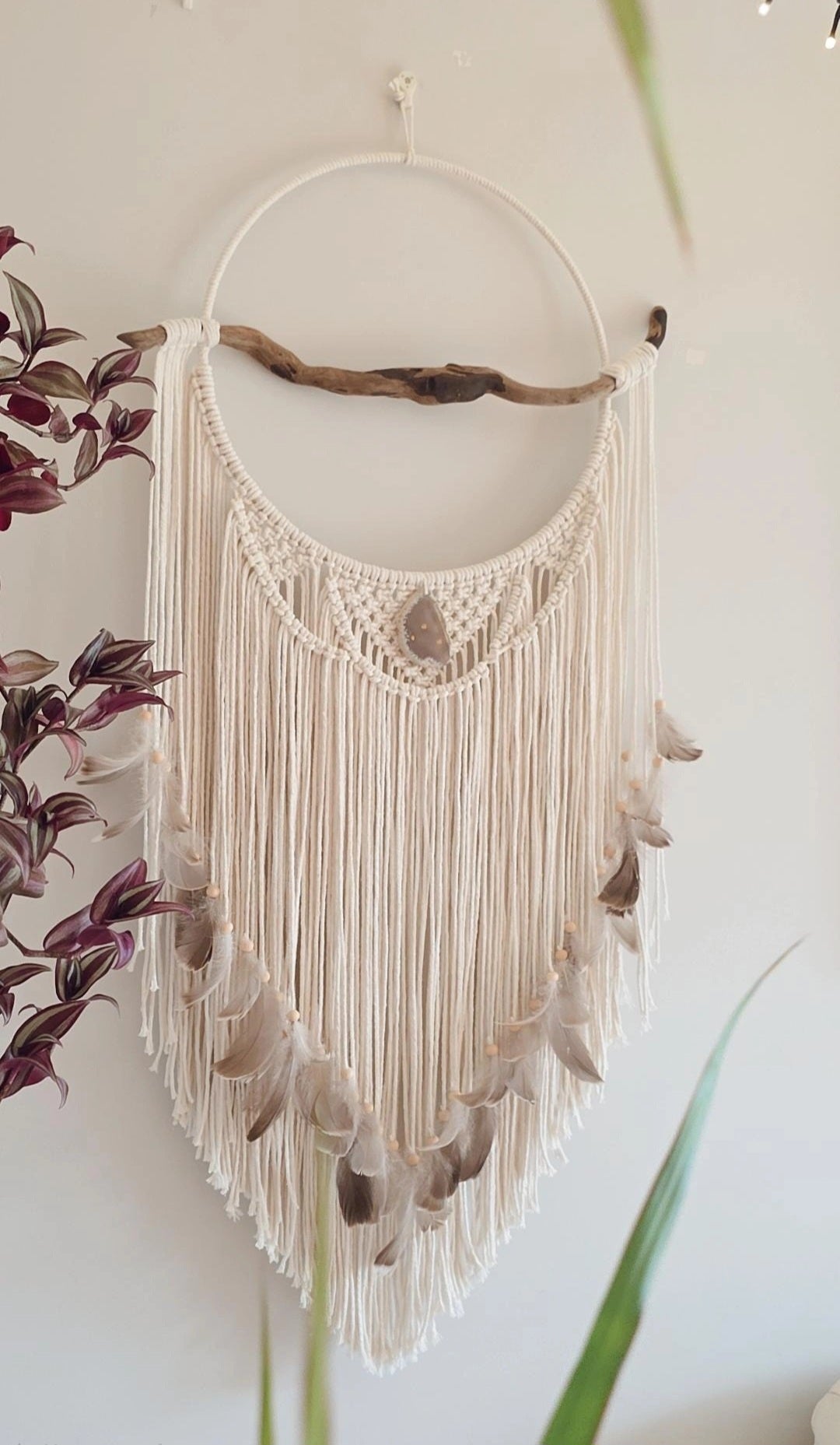 Created using naturally beige cotton cord, metal hoop measuring 35cm wide, a gorgeous driftwood piece, agate slice crystal and matching grey feathers.
